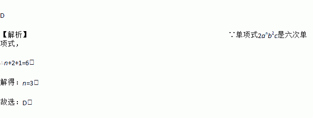 .如果单项式2anb2c是六次单项式,那么n的值取( )