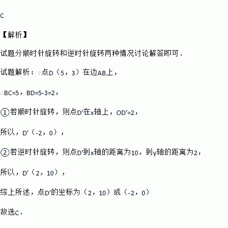如图,正方形OABC的两边OA、OC分别在x轴、y轴上,点D(5,3)在边AB上,以C为中心,把△CDB旋转90°,则旋转后点D的对应点D′的坐标是( )