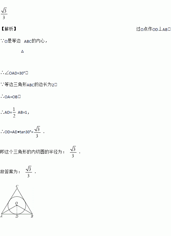 已知等边三角形ABC的边长为2,那么这个三角形的内切圆的半径为_____.
