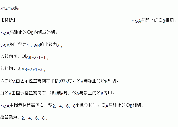 如图,在的网格图中(每个小正方形的边长均为1个单位),⊙A的半径为1,⊙B的半径为2,要使⊙A与静止的⊙B相切,那么⊙A由图示位置需向右平移 个单位。