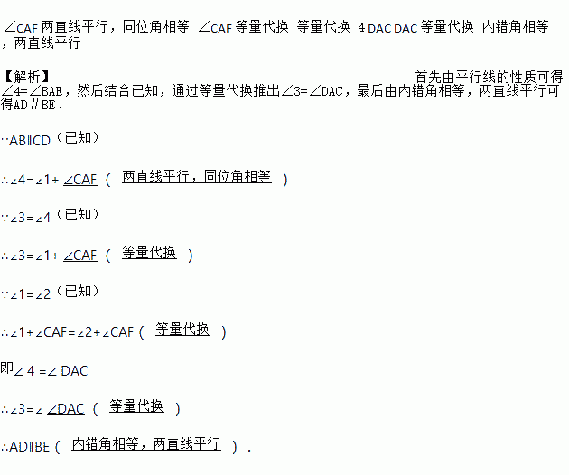 推理填空:如图AB∥CD,∠1=∠2,∠3=∠4,试说明AD∥BE.