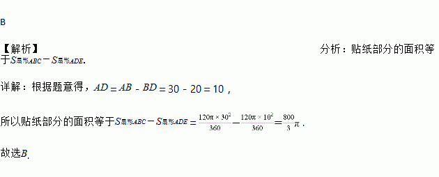 如图,扇形纸扇完全打开后,外侧两竹条AB、AC夹角为120°,AB的长为30cm,贴纸部分BD的长为20cm,则贴纸部分的面积为( )