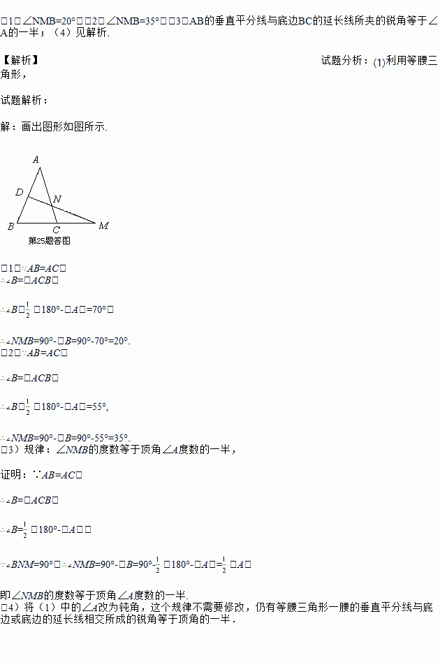 (2)如果将(1)中的∠A的度数改为70°,其余条件不变,再求∠NMB的大小.