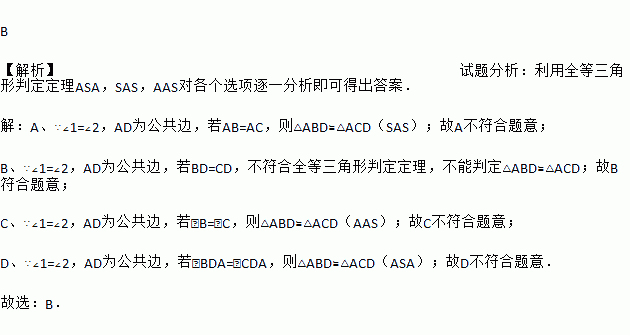 B 【解析】试题分析:利用全等三角形判定定理ASA,SAS,AAS对各个选项逐一分析即可得出答案. 【解析】 A、∵∠1=∠2,AD为公共边,若AB=AC,则△ABD≌△ACD(SAS);故A不符合题意; B、∵∠1=∠2,AD为公共边,若BD=CD,不符合全等三角形判定定理,不能判定△ABD≌△ACD;故B符合题意; C、∵∠1=∠2,AD为公共边,若∠B=∠C,则△A...