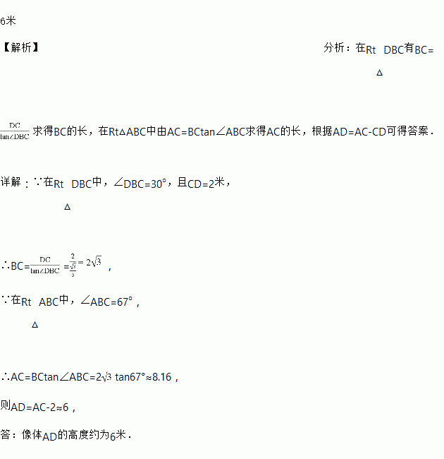 矗立在莲花山的邓小平雕像气宇轩昂,这是中国第一座以城市雕塑形式竖立的邓小平雕像。铜像由像体AD和底座CD两部分组成。某校数学课外小组在地面的点B处测得点A的仰角∠ABC=67°,点D的仰角∠DBC=30°,已知CD=2米,求像体AD的高度。(最后结果精确到1米,参考数据:sin67°≈0.92,cos67°≈0.39,tan67°≈2.4,