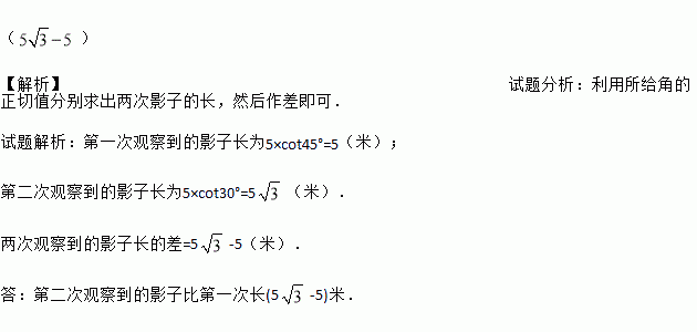 如图所示,平地上一棵树高为5米,两次观察地面上的影子,第一次是当阳光与地面成45°时,第二次是阳光与地面成30°时,第二次观察到的影子比第一次长________ 米.