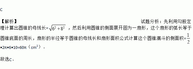 C 【解析】试题分析:先利用勾股定理计算出圆锥的母线长=,然后利用圆锥的侧面展开图为一扇形,这个扇形的弧长等于圆锥底面的周长,扇形的半径等于圆锥的母线长和扇形面积公式计算这个圆锥漏斗的侧面积=•2π•6•10=60π(cm2). 故选C.