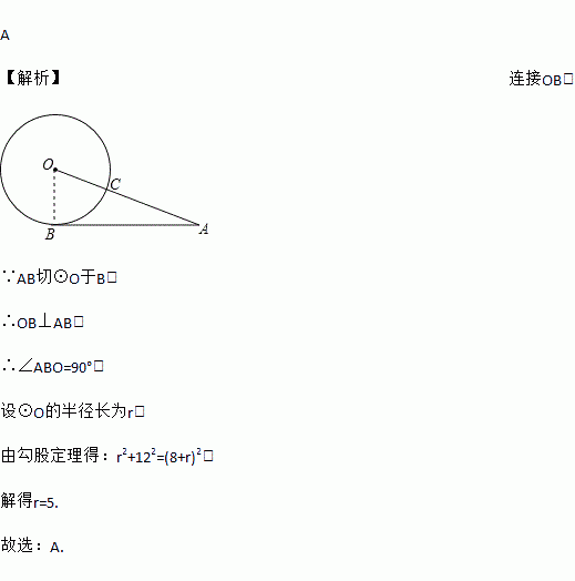 A 【解析】连接OB, ∵AB切⊙O于B, ∴OB⊥AB, ∴∠ABO=90°, 设⊙O的半径长为r, 由勾股定理得:r2+122=(8+r)2, 解得r=5. 故选:A.