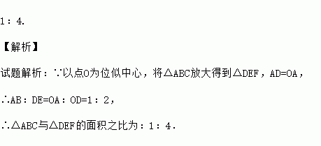 如图,以点O为位似中心,将△ABC放大得到△DEF,若AD=OA,则△ABC与△DEF的面积之比为 .