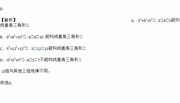 A. 3,4,5 B. 6,8,10 C. 5,12,13 D. 4,5,7
