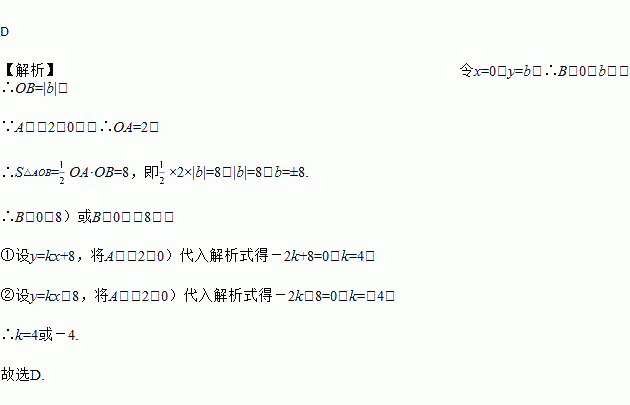 在平面直角坐标系中,点O为原点,直线y=kx+b交x轴于点A(﹣2,0),交y轴于点B.若△AOB的面积为8,则k的值为( )
