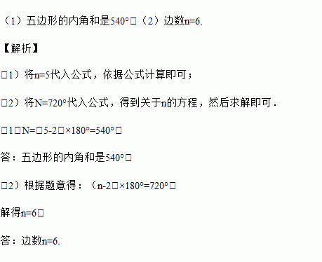 多边形的内角和随着边数的变化而变化.设多边形的边数为n,内角和为N,则变量N与n之间的关系可以表示为N=(n-2)•180°.例如:如图四边形ABCD的内角和:N=∠A+∠B+∠C+∠D=(4-2)×180°=360°问:(1)利用这个关系式计算五边形的内角和;(2)当一个多边形的内角和N=720°时,求其边数n.