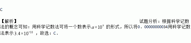石墨烯是现在世界上最薄的纳米材料,其理论厚度仅是0.00000000034m,这个数用科学记数法表示正确的是( )