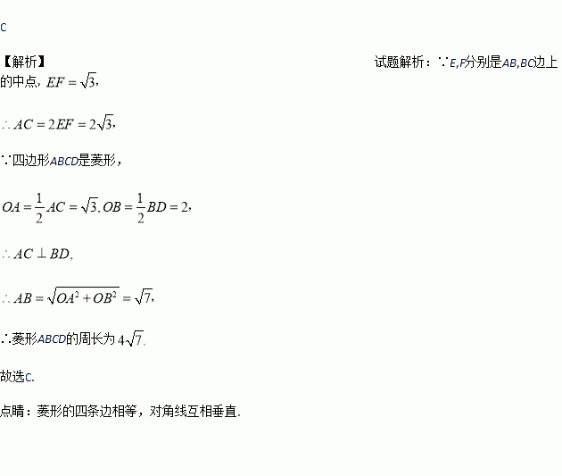 如图,菱形ABCD的对角线AC,BD相交于O点,E,F分别是AB,BC边上的中点,连接EF.若EF=,BD=4,则菱形ABCD的周长为( )