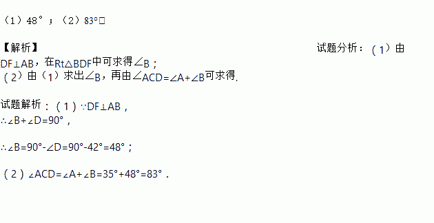 如图,已知D为△ABC的边BC延长线上一点,DF⊥AB于F交AC于E,∠A=35°,∠D=42°.