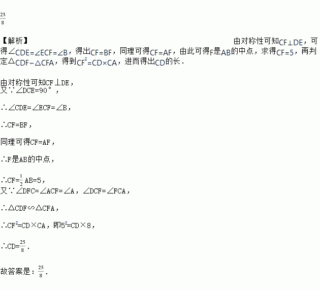 如图,在△ABC中,∠ACB=90°,点D,E分别在AC,BC上,且∠CDE=∠B,将△CDE沿DE折叠,点C恰好落在AB边上的点F处,连接CF.若AC=8,AB=10,则CD的长为__