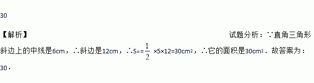 30 【解析】试题分析:∵直角三角形斜边上的中线是6cm,∴斜边是12cm,∴S△=×5×12=30cm2,∴它的面积是30cm2.故答案为:30.