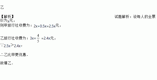 一家三口(父亲、母亲、女儿)准备参加旅行团外出旅游,甲旅行社告知:“父母买全票,女儿按半价优惠”,乙旅行社告知:“家庭旅游可按团体票计价,即每人均按全价的