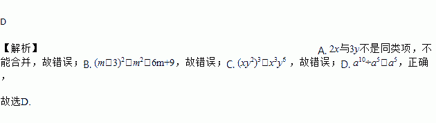 A. 2x+3y=5xy B. (m+3)2=m2+9 C. (xy2)3=xy6 D. a10÷a5=a5