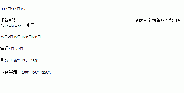 如果一个四边形三个内角度数之比为2∶1∶3,第四个内角为60°,那么这三个内角的度数分别为______________________.