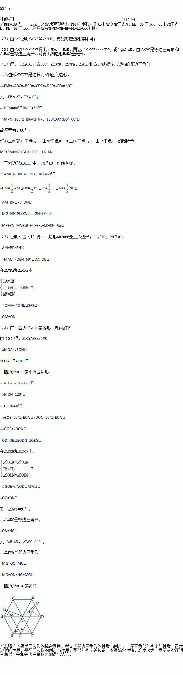如图1,已知△OAB、△OBC、△OCD、△ODE、△OEF和△OFA均为边长为a的等边三角形,点P为边BC上任意一点,过P作PM∥AB交AF于M,作PN∥CD交DE于N.![]()