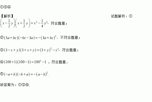 y),②(3a+bc)(-bc-3a),③(3-x+y)(3+x+y),④(100+1)(100-1)⑤(-a+b)(-b+a)中能用平方差公式计算的是______ (填序号)