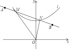 如图,曲线l是由函数y= 在第一象限内的图象绕坐标原点O逆时针旋转45°得到的,过点A(﹣4 ,4),B(2,2)的直线与曲线l相交于点M、N,则△OMN的面积为________.