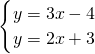 函数y=3x-4与函数y=2x+3的交点的坐标是