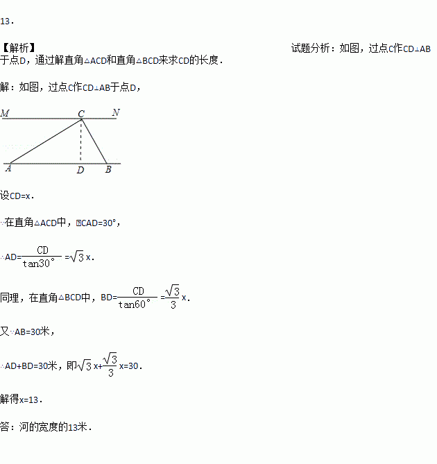 河岸AB与MN之间的距离).在测量时,选定河对岸MN上的点C处为桥的一端,在河岸点A处,测得∠CAB=30°,