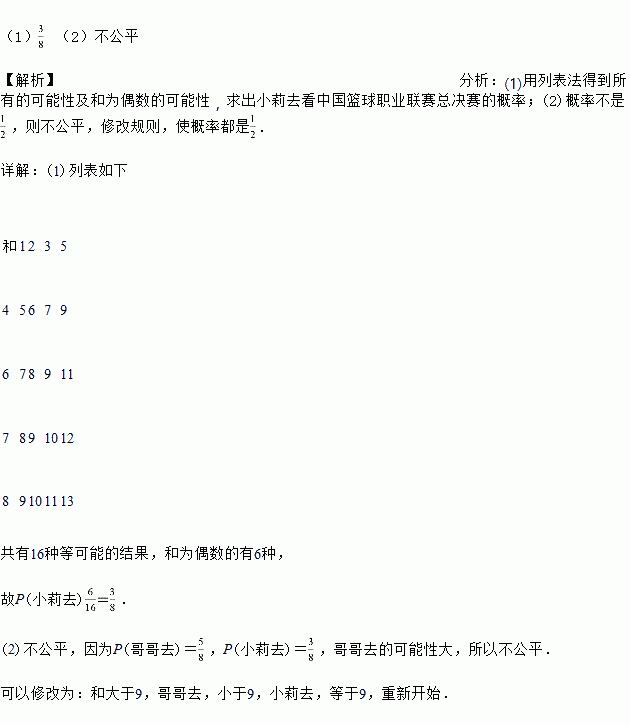 小莉的爸爸买了去看中国篮球职业联赛总决赛的一张门票,她和哥哥两人都很想去观看,可门票只有一张,读九年级的哥哥想了一个办法,拿了八张扑克牌,将数字为1,2,3,5的四张牌给小莉,将数字为4,6,7,8的四张牌留给自己,并按如下游戏规则进行:小莉和哥哥从各自的四张牌中随机抽出一张,然后将抽出的两张扑克牌数字相加,如果和为偶数,则小莉去;如果和为奇数,则哥哥去.