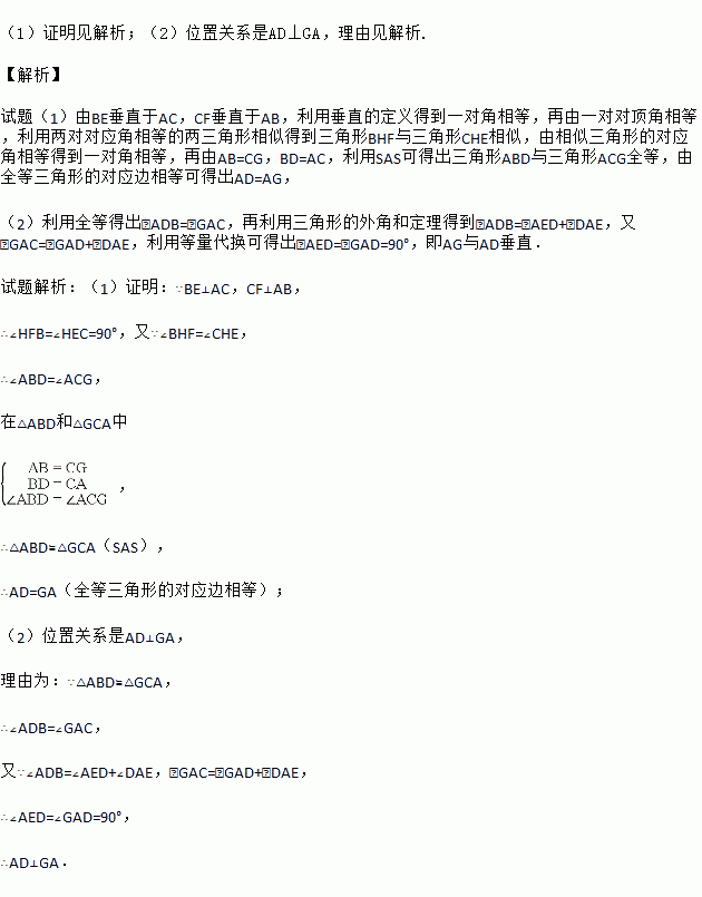 如图:在△ABC中,BE、CF分别是AC、AB两边上的高,在BE上截取BD=AC,在CF的延长线上截取CG=AB,连接AD、AG.