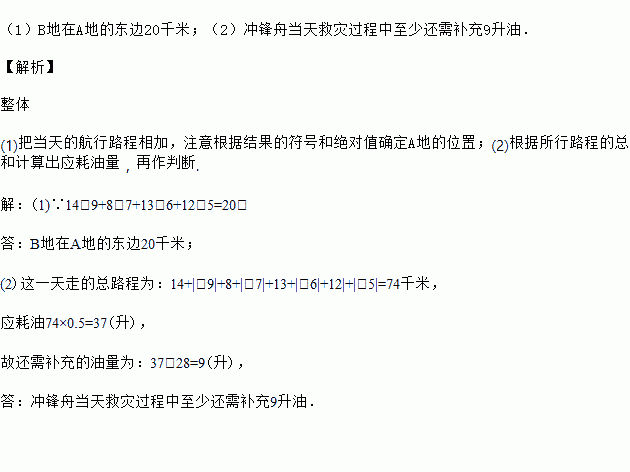 在抗洪抢险中,解放军战士的冲锋舟加满油沿东向西方向的河流抢救灾民,早晨从A地出发,晚上到达B地,约定向东为正方向,当天的航行路程记录如下单位:千米![]()