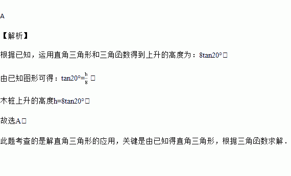 如图,将一个Rt△ABC形状的楔子从木桩的底端点P处沿水平方向打入木桩底下,使木桩向上运动,已知楔子斜面的倾斜角为20°,若楔子沿水平方向前移8cm(如箭头所示),则木桩上升了( )