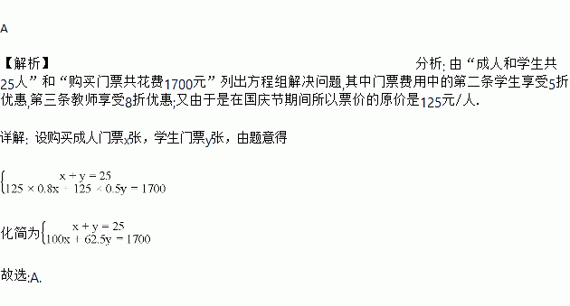某校准备在国庆节期间组织学生到泰山进行研学旅行,已知老师与学生一共25人参加此次研学旅行,购买门票共花费1700元,门票费用如表格所示,求参加研学旅行的老师和学生各有多少人?设老师有x人,学生有y人,则可列方程组为( )