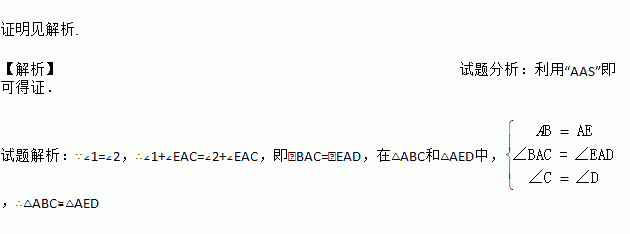 如图,AB=AE,∠B=∠AED,∠1=∠2.求证:△ABC≌△AED.