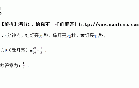十字路口的交通信号灯红灯亮25秒,绿灯亮20秒,黄灯亮15秒,当你抬头看信号灯时,恰好是绿灯的概率是_____.