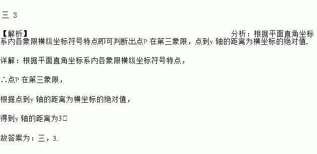 已知点P的坐标为(-3,-2),则点P在第_______象限,到轴的距离为________![]()