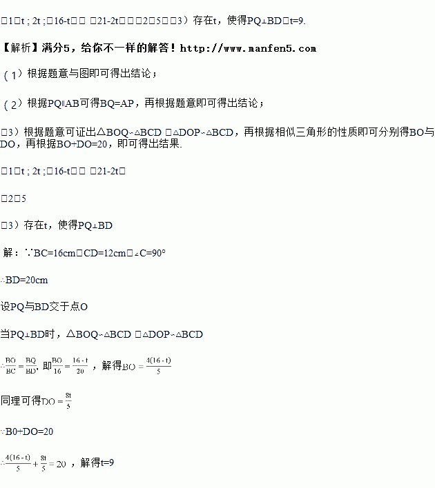 如图,在四边形ABCD中,AD∥BC,∠C=90°,BC=16cm,DC=12cm,AD=21cm,点P以2cm/s的速度沿DA边由点D向点A运动,同时点Q以1cm/s的速度沿CB边由点C向点B运动,而且当其中一点停止运动时另一点也停止运动。设运功时间为t(s)