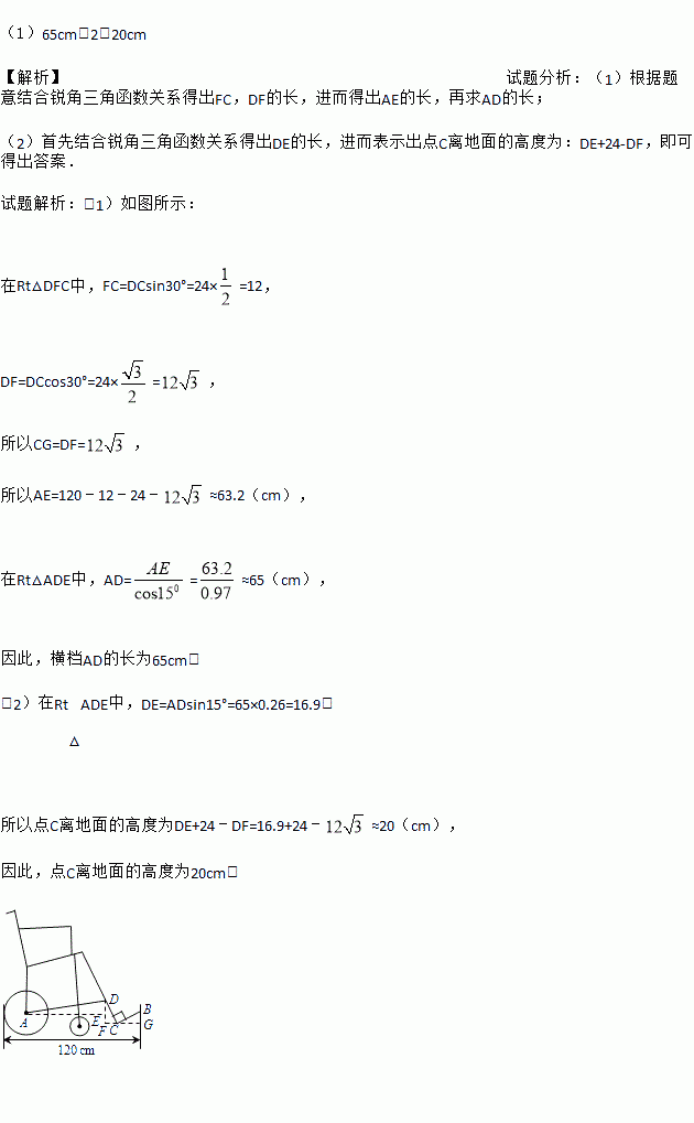 为了应对人口老龄化问题,国家大力发展养老事业.某养老机构定制轮椅供行动不便的老人使用.图①是一种型号的手动轮椅实物图,图②为其侧面示意图,该轮椅前后长度为120cm,后轮半径为24cm,CB=CD=24cm,踏板CB与CD垂直,横档AD、踏板CB与地面所成的角分别为15°、30°.求: