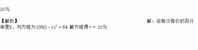 某药品原价是100元,经连续两次降价后,价格变为64元,如果每次降价的百分率是一样的,那么每次降价的百分率是 ;