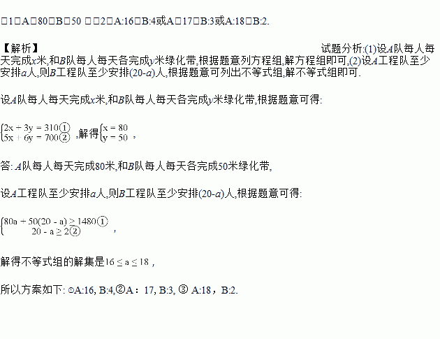(2)该公司决定派A、B工程队共20人参与建设绿化带,若每天完成绿化带总量不少于1480米,且B工程至少派出2人,则有哪几种人事安排方案?