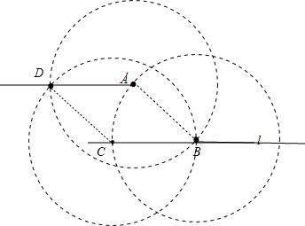 分析 先以点B为圆心,BA为半径作⊙B,再分别以A、C为圆心,AB为半径作⊙A、⊙C,⊙A与⊙C相交于点D,根据半径相等可证明四边形ABCD为菱形,于是可判定AD与l平行.