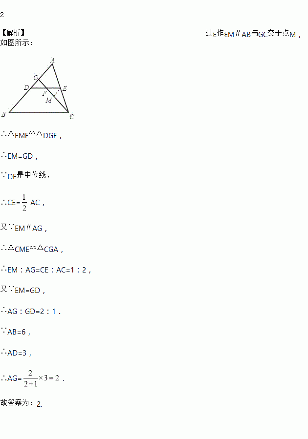 如图,DE是△ABC的中位线,F是DE的中点,CF的延长线交AB于G,AB=6,则AG=_____.