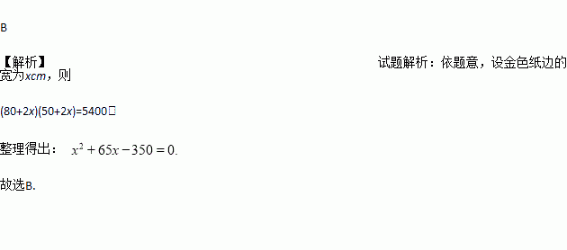 在一幅长80cm,宽50cm的矩形风景画的四周镶等宽的金色纸边,制成一幅矩形挂图,如图所示,如果要使整个挂图的面积是5400 cm2,设金色纸边的宽为