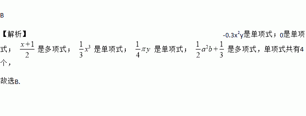 B 【解析】-0.3x2y是单项式;0是单项式; 是多项式; 是单项式; 是单项式; 是多项式,单项式共有4个, 故选B.