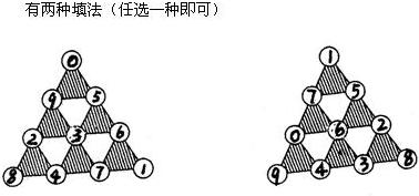 24、将0,1,2,3,4,5,6,7,8,9分别填入如下图的十个圆圈内(每个数只准填一次).使得每个阴影三角形的三个顶点处的圆圈内所填的数之和都相等.请将相应填法用示意图表示出来.(填写一种即可)