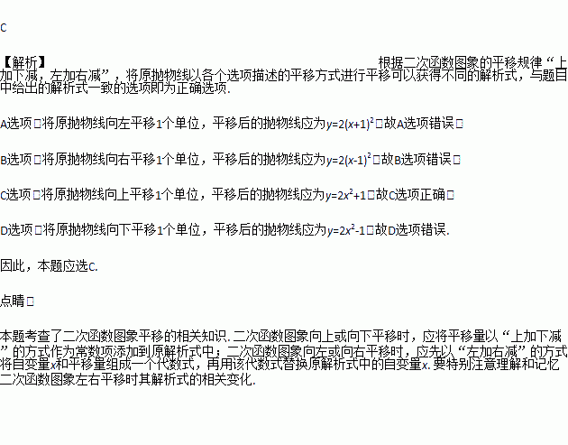 将抛物线y=2x2平移后得到抛物线y=2x2+1,则平移方式为( )