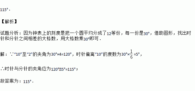 115°. 【解析】 试题分析:因为钟表上的刻度是把一个圆平均分成了12等份,每一份是30°,借助图形,找出时针和分针之间相差的大格数,用大格数乘30°即可. 【解析】 ∵“10”至“2”的夹角为30°×4=120°,时针偏离“10”的度数为30°×=5°, ∴时针与分针的夹角应为120°﹣5°=115°; 故答案为:115°.