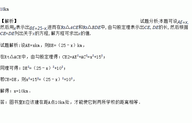 为了丰富少年儿童的业余生活,某社区要在如图所示AB所在的直线建一图书室,本社区有两所学校所在的位置在点C和点D处,CA⊥AB于A,DB⊥AB于B,已知AB=25km,CA=15km,DB=10km,试问:图书室E应该建在距点A多少km处,才能使它到两所学校的距离相等?