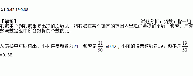21 0.42 19 0.38 【解析】试题分析:频数:指一组数据中个别数据重复出现的次数或一组数据在某个确定的范围内出现的数据的个数。频率:是频数与数据组中所含数据的个数的比。 从表格中可以读出:小林得票频数为21,频率是=0.42,小丽的得票频数是19,频率是 =0.38.